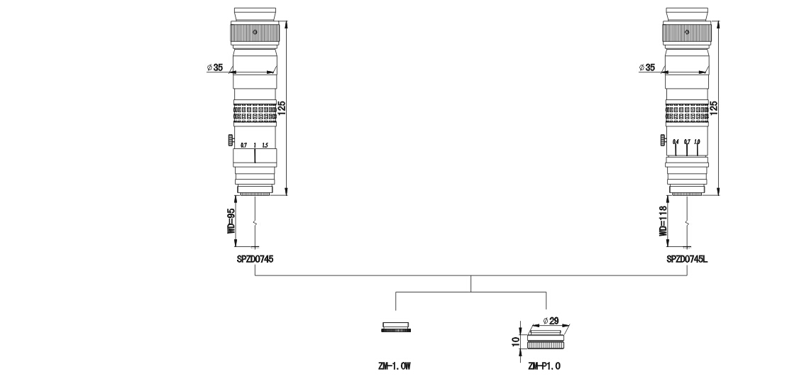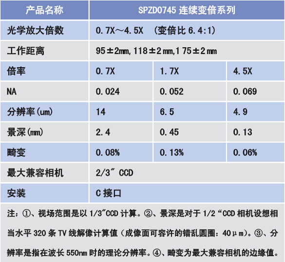 ● 物镜连续变倍0.7X~4.5X, 变倍比:6.4∶1